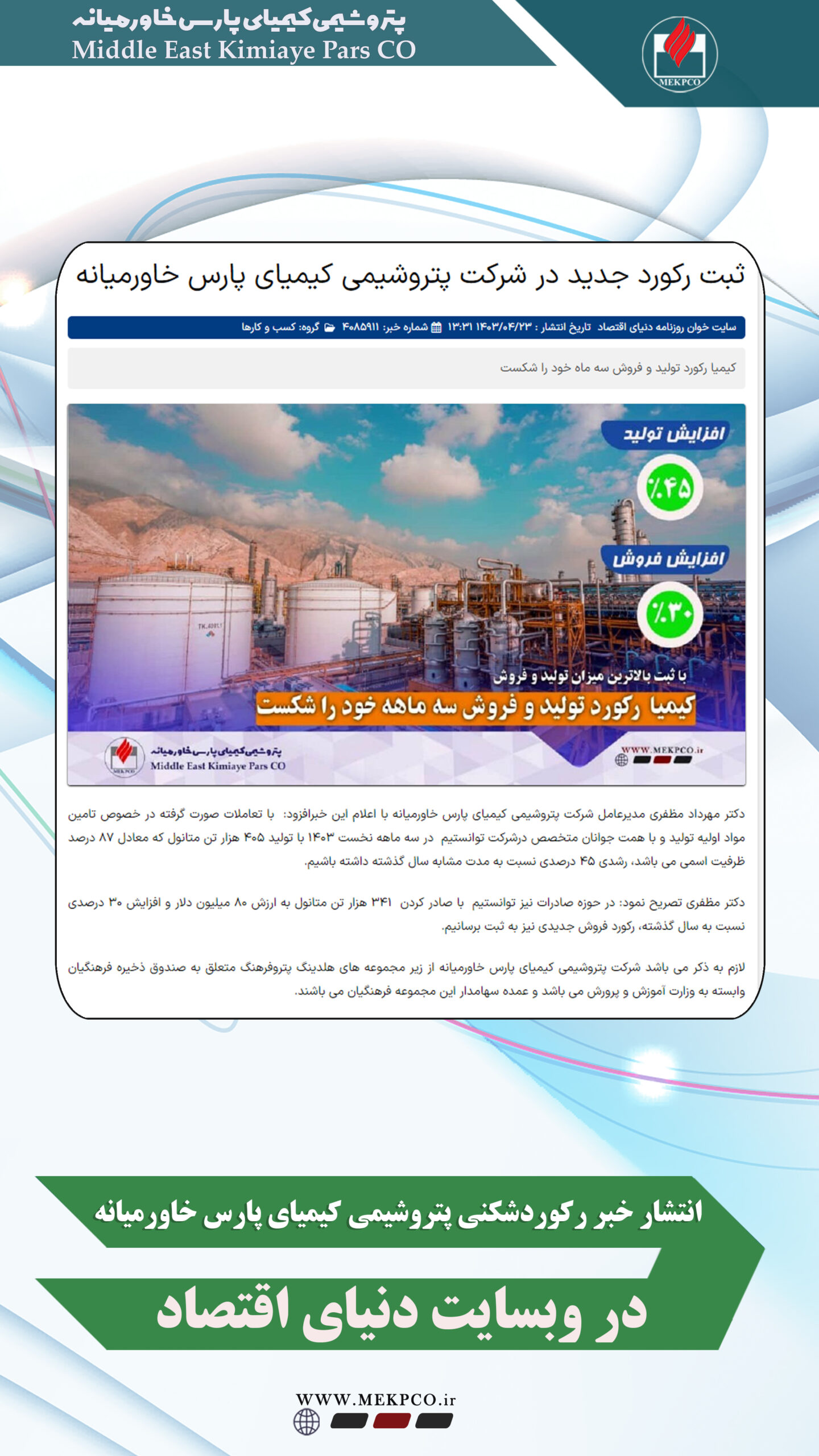 انتشار خبر رکورد شکنی کیمیای پارس خاورمیانه در وبسایت دنیای اقتصاد