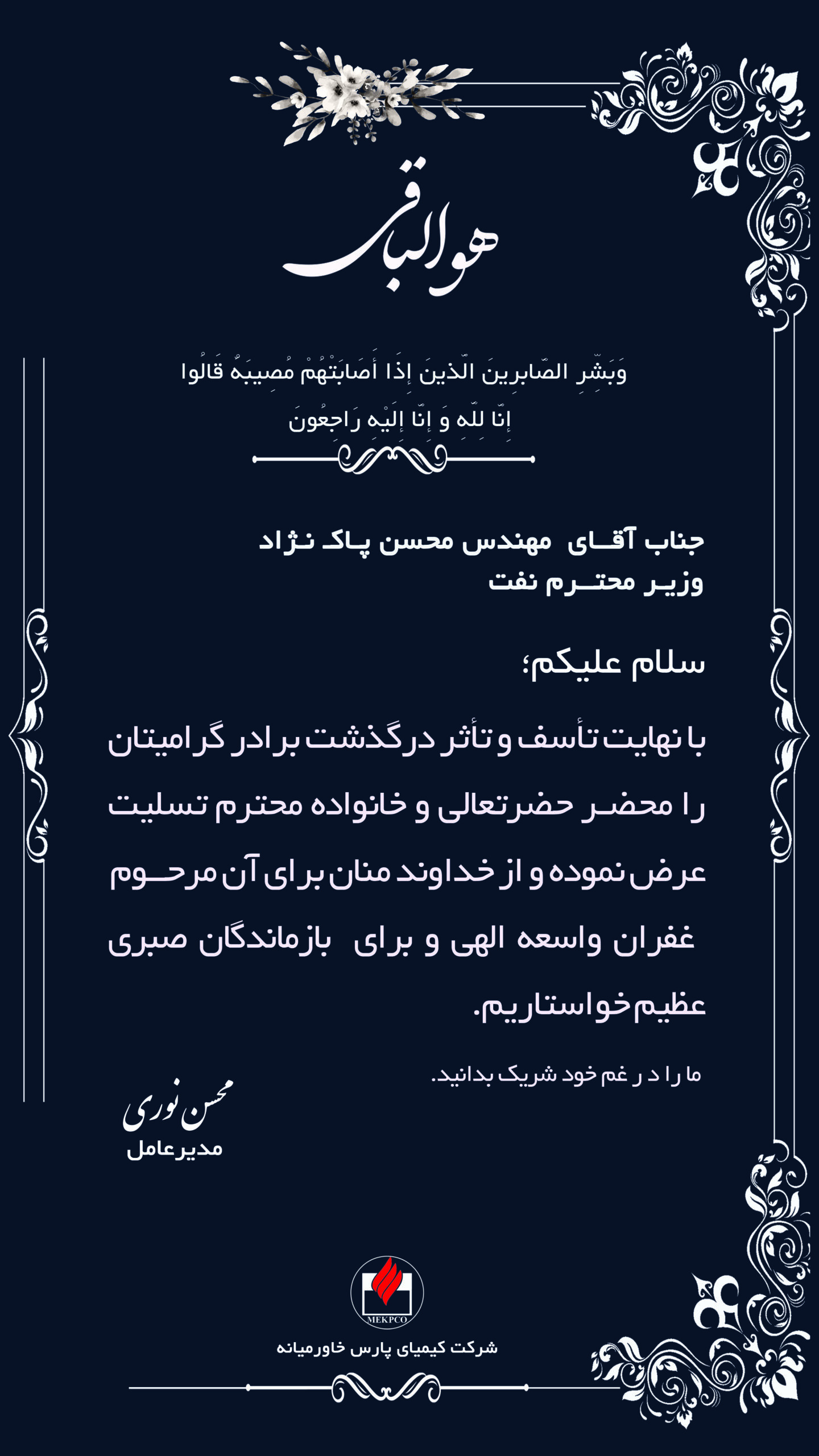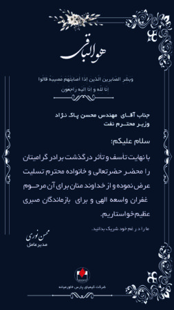 پیام تسلیت دکتر نوری مدیرعامل شرکت در پی درگذشت برادر وزیر نفت